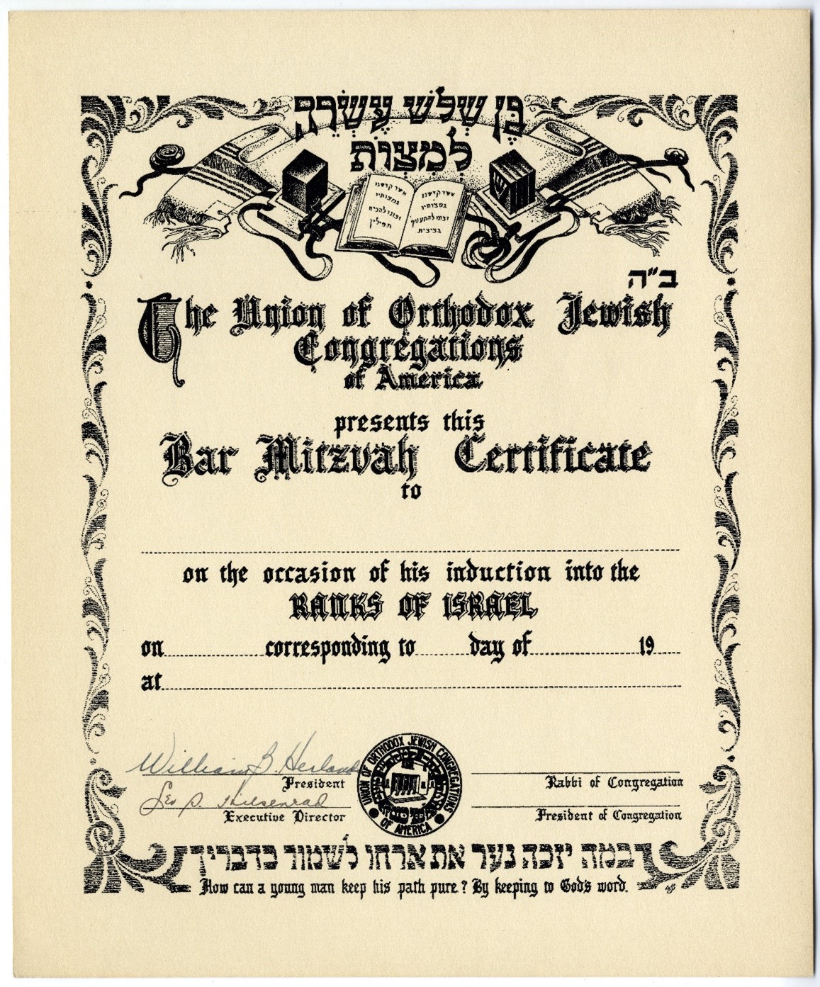 The bar-mitzvah, a rite of passage marking the entry of a thirteen-year-old boy to Jewish adulthood and responsibility, was sometimes also marked by a certificate, a sign of recognition of full-fledged membership in the world of Jewish ritual. This striking certificate, by an unknown artist, was issued by the Orthodox Union, most likely in the 1950s when William Herlands, signatory on the certificate, was president of the Orthodox Union. The certificate depicts a pair of tefillin, a tallit, and a prayerbook with the blessings for donning these items. It also quotes a relevant verse from Psalms, Tehillim 119:9, in Hebrew and in English translation: “How can a young man keep his path pure? By keeping to God’s word.” The certificate displays an Orthodox Union logo which differs from the organization’s well-known kashruth symbol; this emblem specifically relates to the synagogue aspect of the Orthodox Union, which included the term “congregations” in its name at the time.